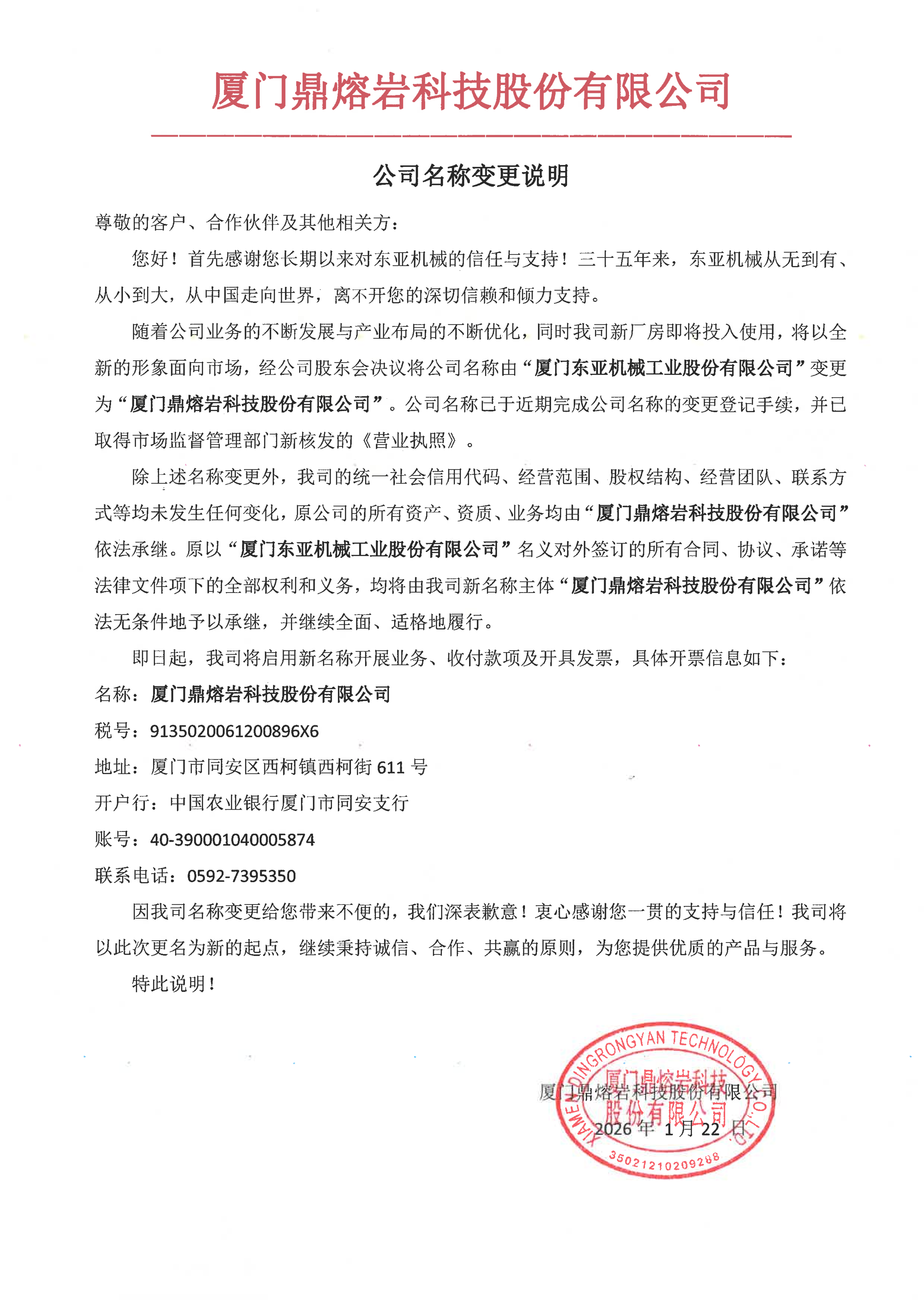 關于“東亞機械”更名為“鼎熔巖”的名稱變更說明